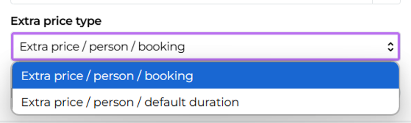- additional price per person per default duration: This option applies the additional charge for each extra person based on the activity’s default duration. For example, if the default duration is 60 minutes and the additional charge is €10 per person per hour, the charge will multiply according to the booking duration.