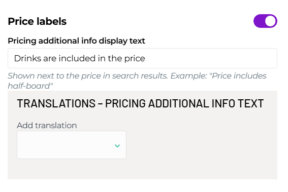 For example: in English: "Price includes breakfast" or "Includes equipment rental". This way, the price label will appear to customers in their selected language, improving their experience and understanding.