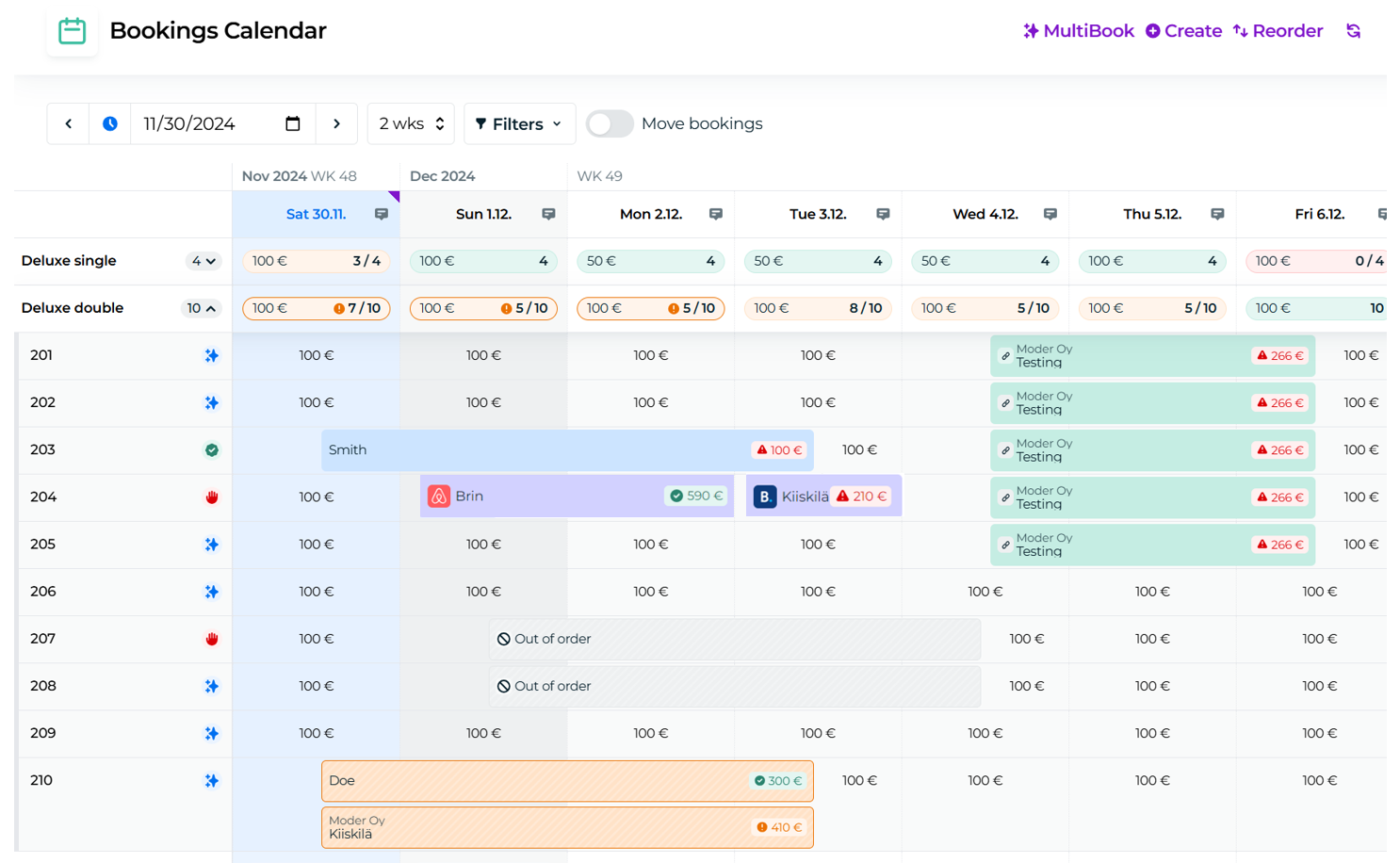 The booking calendar is a key tool in Moder, offering a clear overview of all bookings, room statuses, and reservation states at a glance. It helps you monitor bookings, manage room usage, and make necessary changes efficiently. This guide explains the main features of the booking calendar and how to use them.