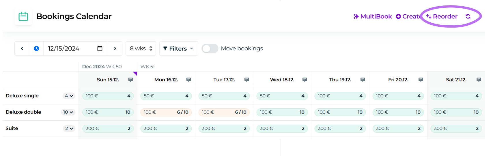 - Click the "Reorder" button in the top-right corner of the booking calendar.