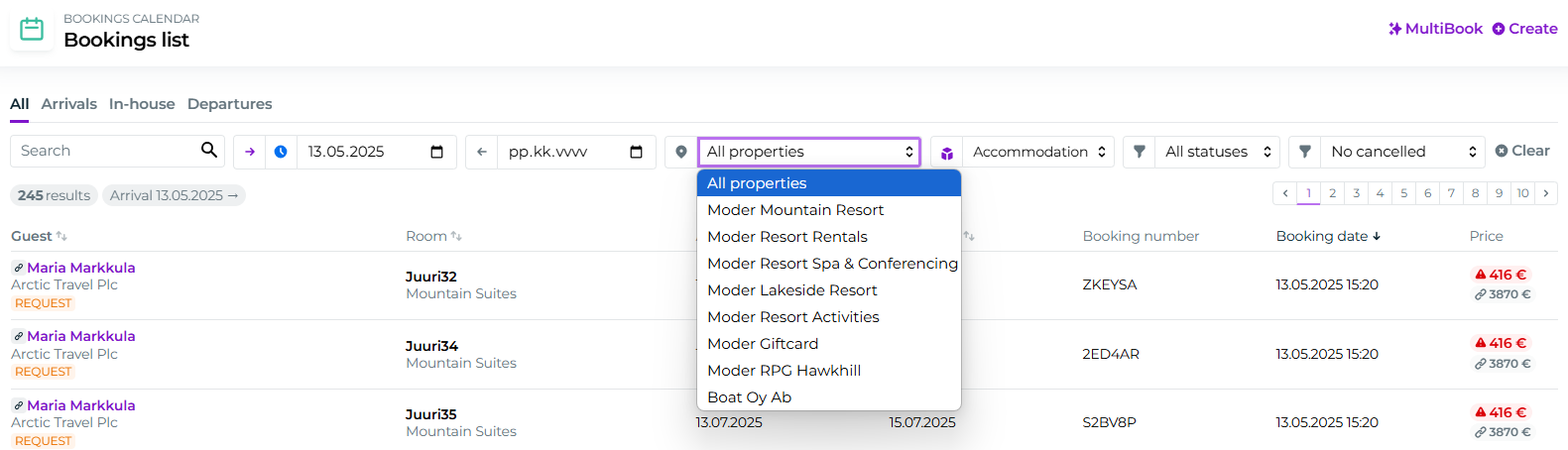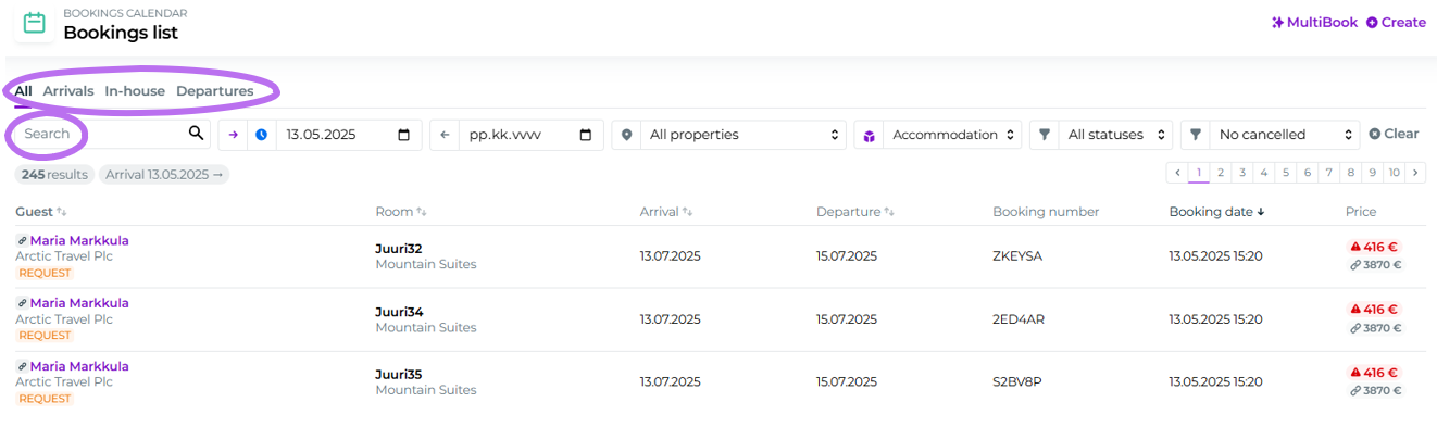 You can search for bookings using a variety of details such as the guest’s name, booking number, phone number, or email address. This is a fast and flexible way to locate individual bookings even in large datasets.