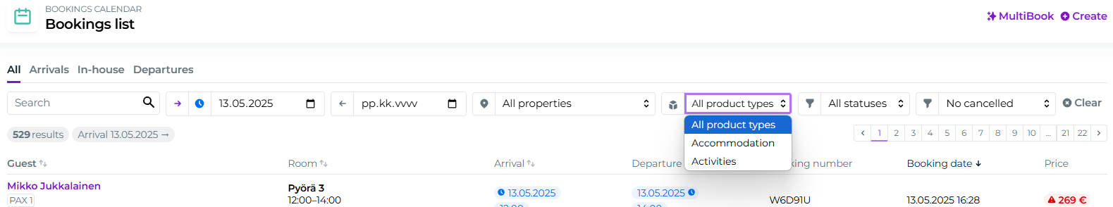 - Product Types: Choose whether to view all bookings, or only accommodation or activity bookings