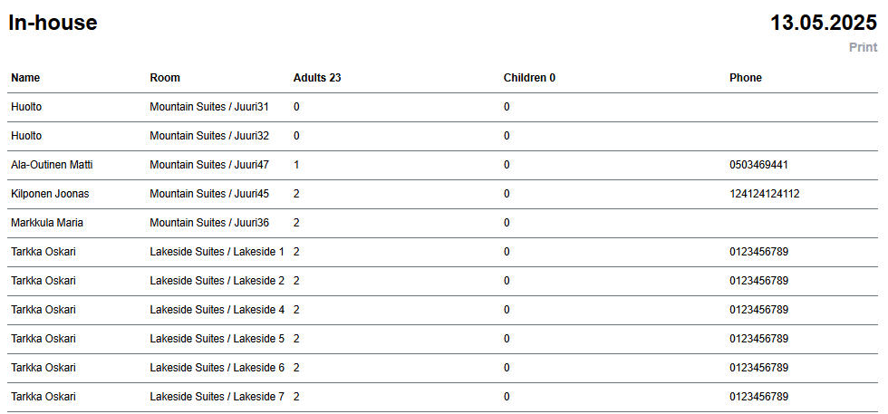 - Print: Use the print icon to generate a printable list of guests currently in-house