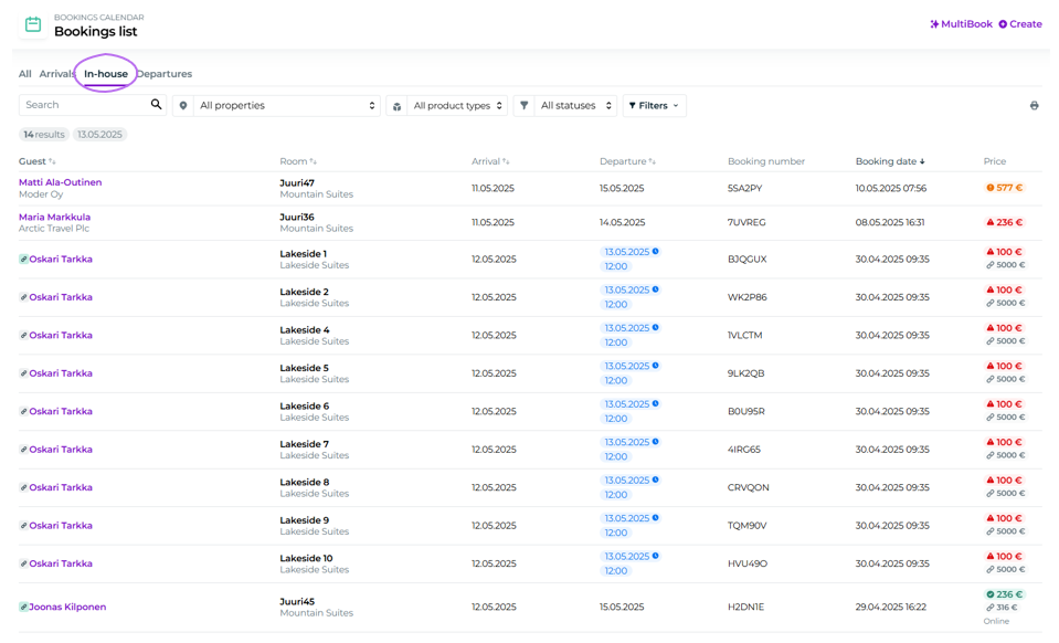 The In-House view lists all bookings currently inside the property. It gives you a real-time overview of the bookings that are actively in-house.