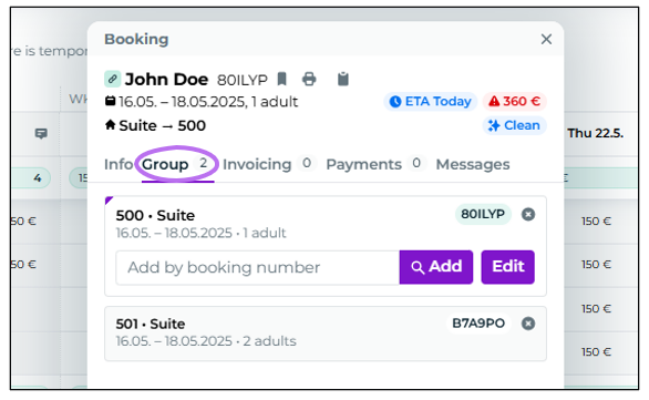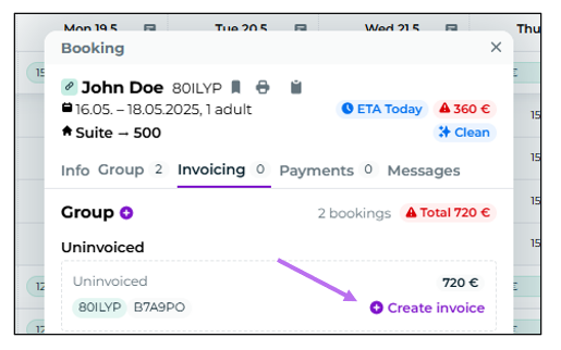 If the booking is a group booking (as shown in the example below: Booking group for 2 rooms), this feature allows you to create a single consolidated invoice for the entire group at once.
