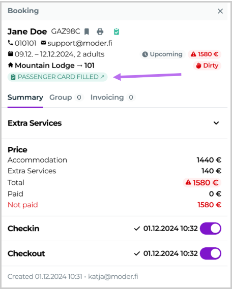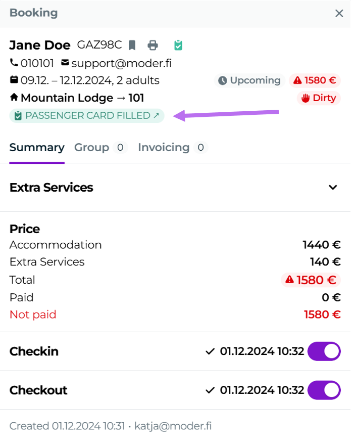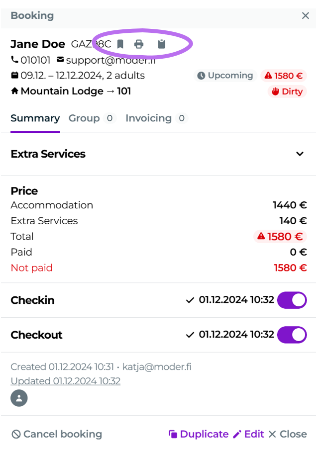 The Moder booking preview view provides a quick and clear overview of the customer’s booking details at a glance. You can see essential information such as check-in and check-out dates, room or service type, group, billing, payment and order details, as well as any booked and purchased add-on services.