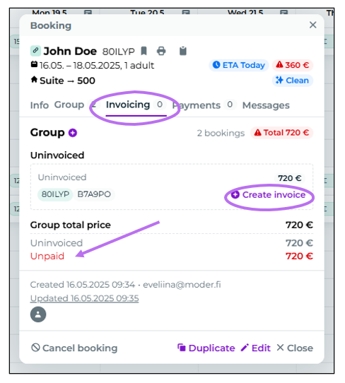 provides a clear and efficient overview of all invoices related to a booking or group booking, including the status of unpaid invoices. There may be multiple invoices listed here.