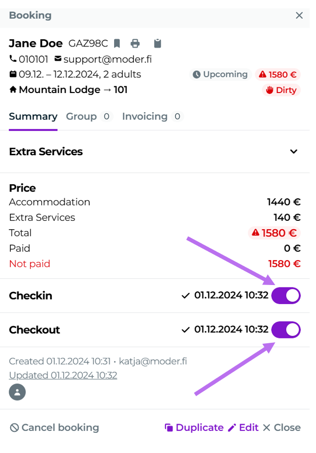 In this view, you can toggle the check-in and check-out buttons on or off. Note that these buttons can be activated at any time on a booking—activating them does not require a payment or the customer's physical arrival. The use of these buttons is neither mandatory nor enforced for Moder’s functionality.