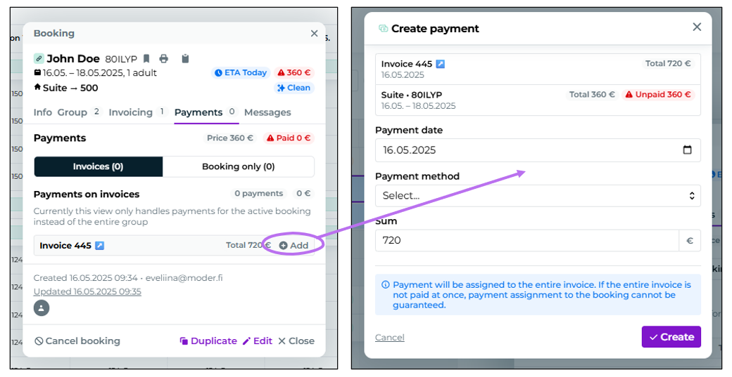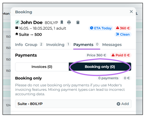 - Payment entry on the booking. If you're not creating an invoice in Moder (e.g., you’re billing through external accounting software), you can log the payment directly to the booking. This might apply to specific bookings or booking groups handled outside Moder.