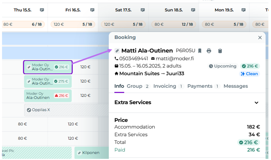 Group Booking Name. If a booking is part of a group booking, the group name will be shown in the view. By clicking the group booking name, you’ll be taken directly to the group booking page.
