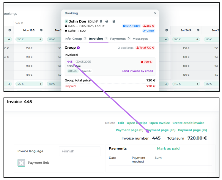 If an invoice already exists for the booking, click on the invoice number to open it directly. From there, you can easily make edits or record payments.