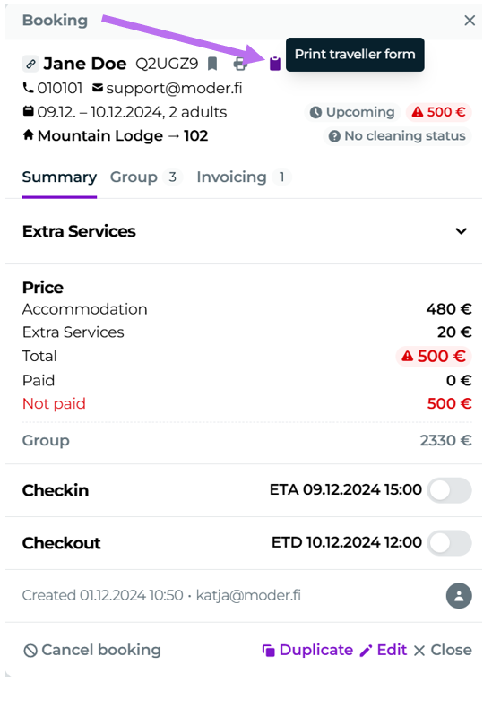 If the traveler has not completed the form in advance, you can always print a blank traveler form from the booking. To do this, go to the booking preview view and click the button "Print traveler form."