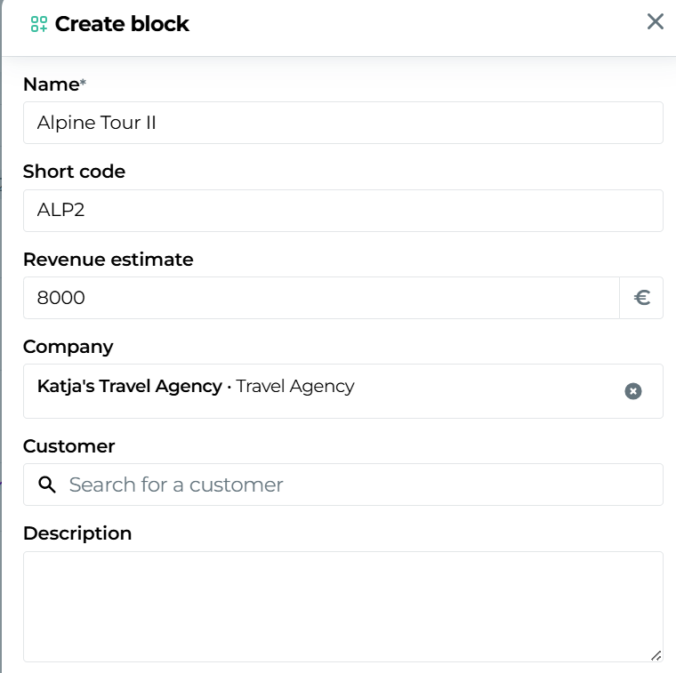 3. Fill in the block details: name, short identifier, and estimated revenue. In the Company field, you can link the company profile you previously created if you wish.