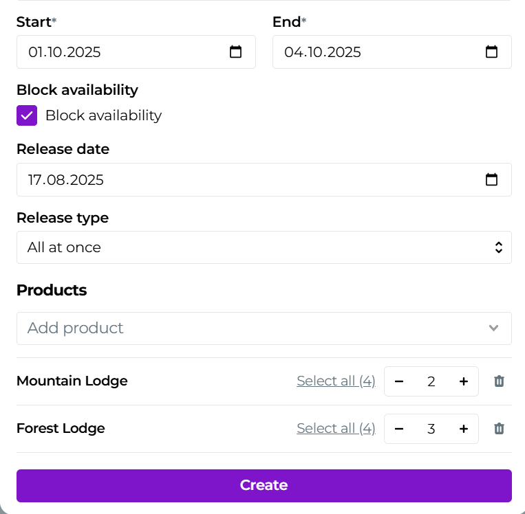*Please note that at this time, the blocks feature is not supported together with the cross-selling feature. This means that if you block rooms, and the same items are available for cross-selling on another Moder platform, the blocking of the rooms will not be visible to your partner’s Moder or webshop. Availability also cannot be blocked from their calendar. *
