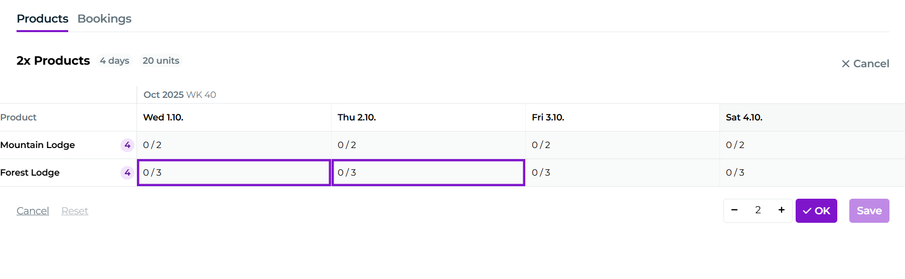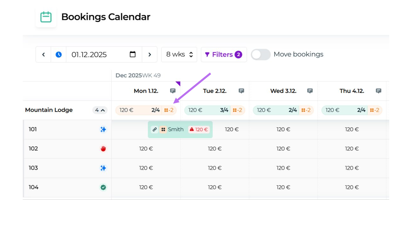 In the booking calendar, you can see how many rooms from each category are reserved in blocks.