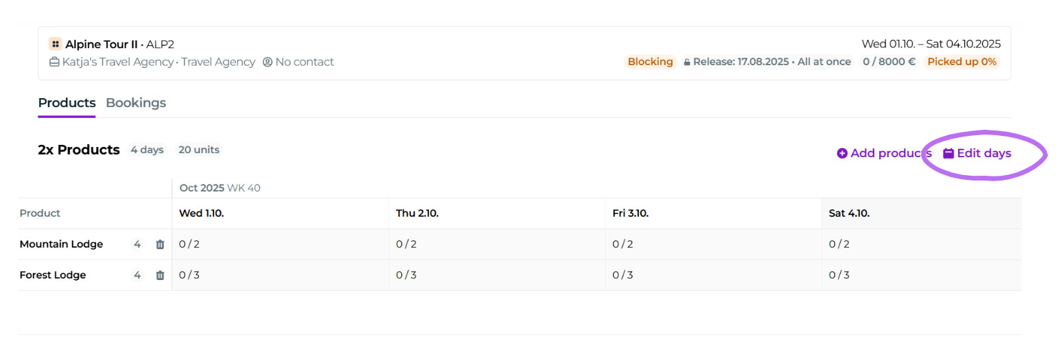 If you want to edit the number of rooms for an already added category or adjust the room quantities per day, click the "Edit days" button.