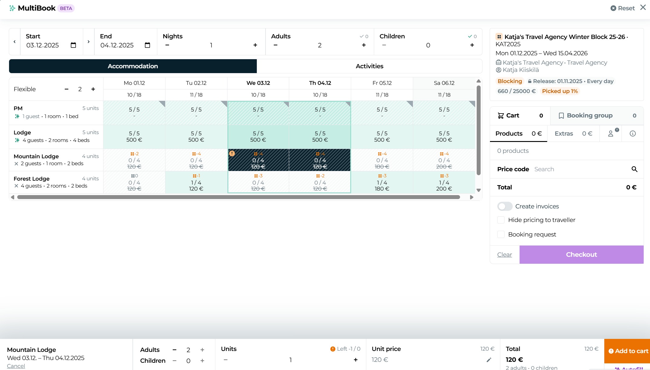 After opening the MultiBook tool, the orange triangle will indicate which room categories have rooms reserved in the block. Add the rooms to the MultiBook cart as usual and proceed to checkout.