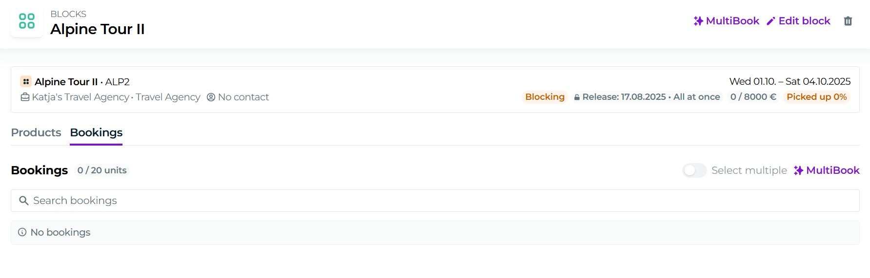 You can create bookings from a block in two ways: by going to the block’s "Bookings" tab or by creating a new group booking and linking the block to the group booking.