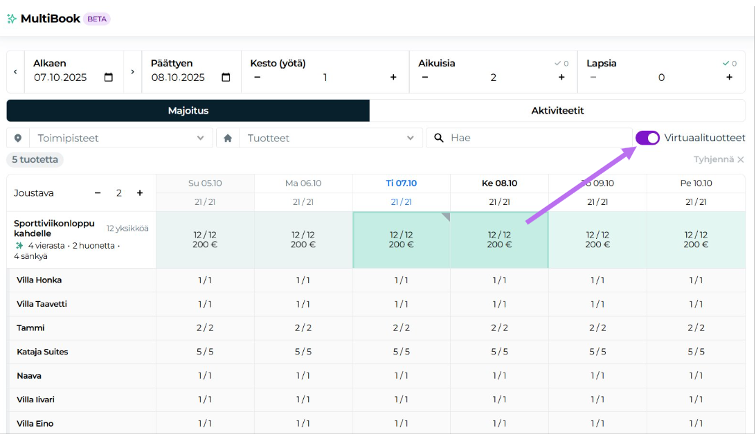 MultiBookista voi nyt varata myös virtuaalituotteita! Löydät ne helposti aktivoimalla liukupainikkeesta “Virtuaalituotteet” päälle – ja pääset tekemään varauksia suoraan kuten muidenkin tuotteiden kohdalla.