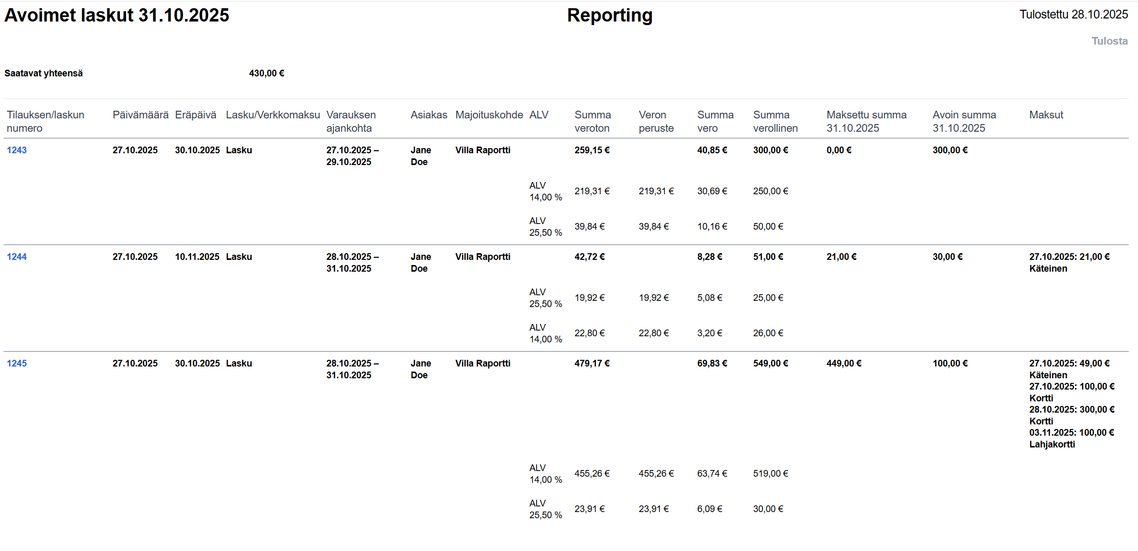 Raportti näyttää nyt tilanteen raportin päättymispäivän mukaisesti – eli se näyttää samat tiedot riippumatta siitä, milloin raportti otetaan. Esimerkiksi avoimia laskuja päivältä 30.9.2025 tarkasteltaessa raportti näyttää samat tiedot sekä 1.10.2025 että 1.1.2026, vaikka laskut olisi maksettu myöhemmin.