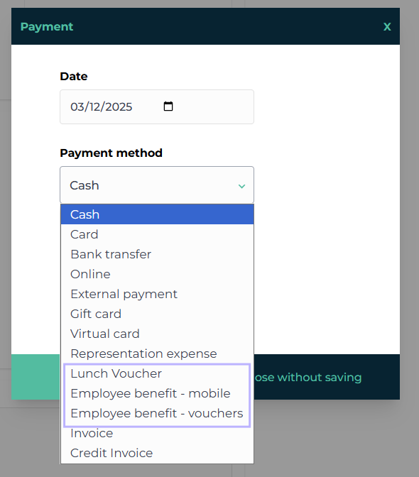 Introducing new payment types: Lunch Voucher, Employee benefit - mobile & Employee benefit - vouchers.